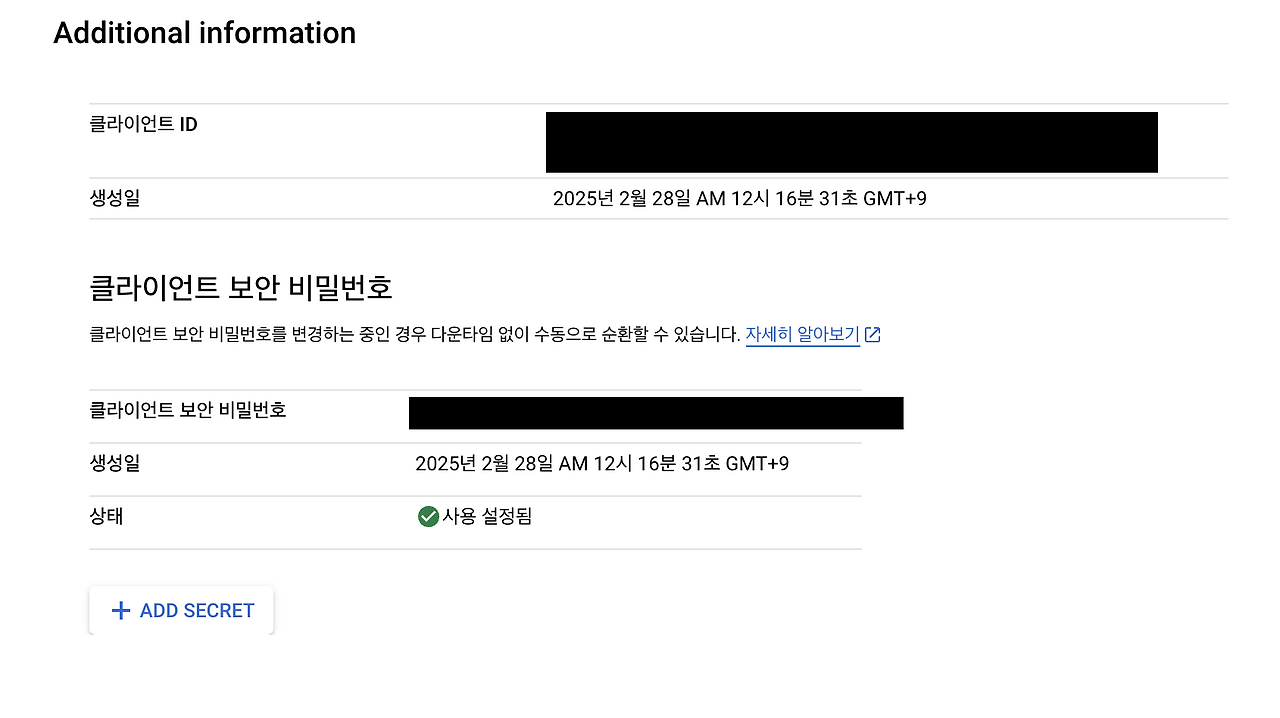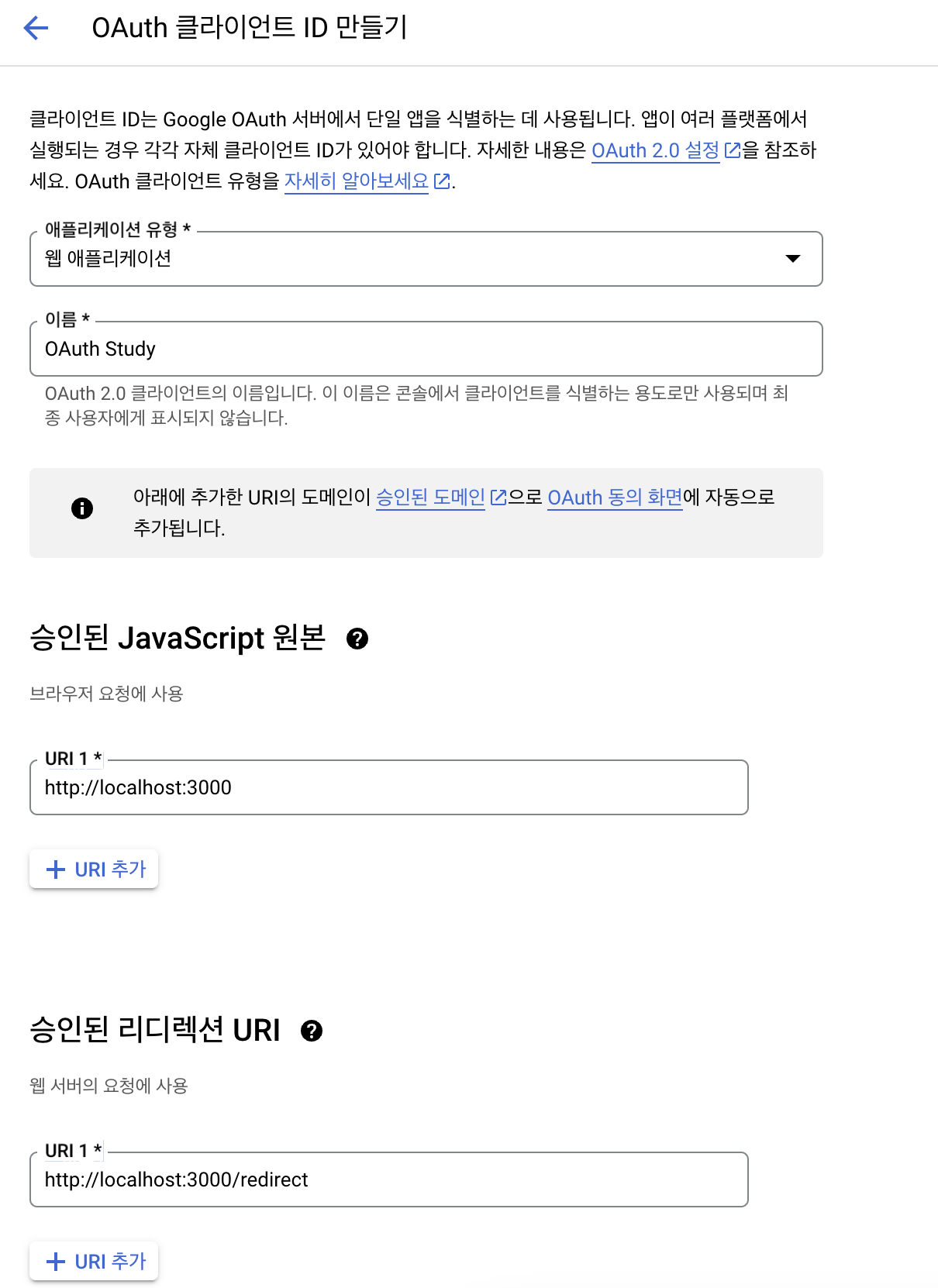 : 로컬 개발 환경인 경우에는, localhost 도메인을 적어주면 된다. - 승인된 리디렉션 uri
